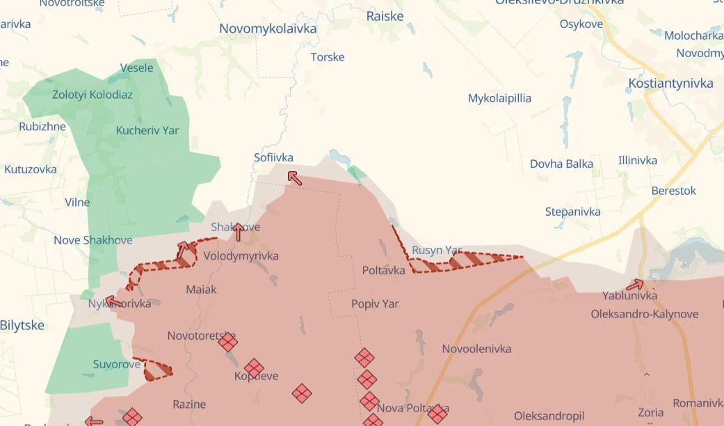 Армия России продвинулась возле Русина Яра и Нового Шахово и в Федоровке в выступе восточнее Константиновки, сообщает Deep State.