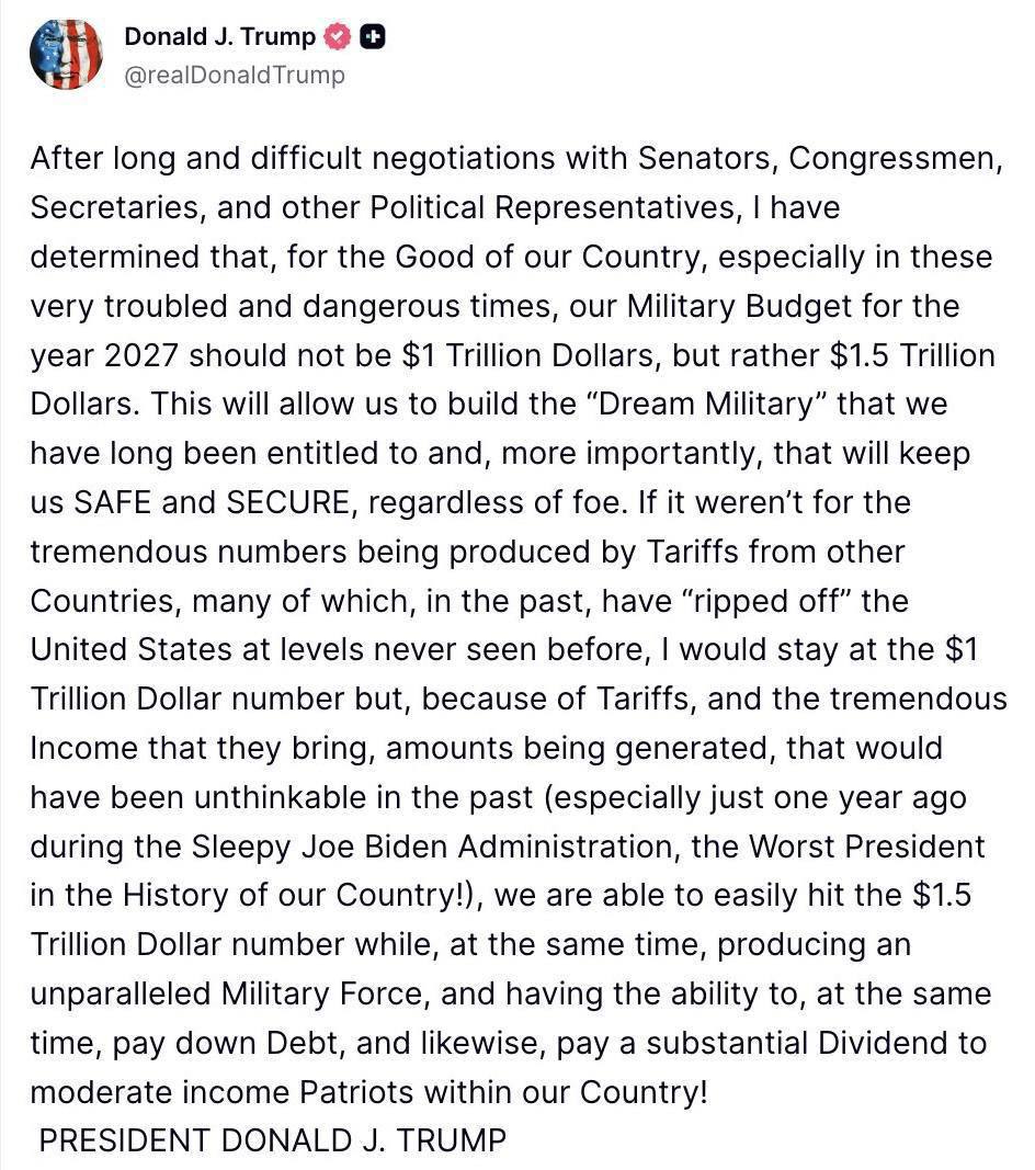Самое интересное — заявление, что эти безумные траты «легко» окупятся тарифами. То есть, простые американцы и все их торговые партнёры заплатят за новые авианосцы и ракеты, которые направят против… кого? Кого США назначили своим следующим «врагом»?