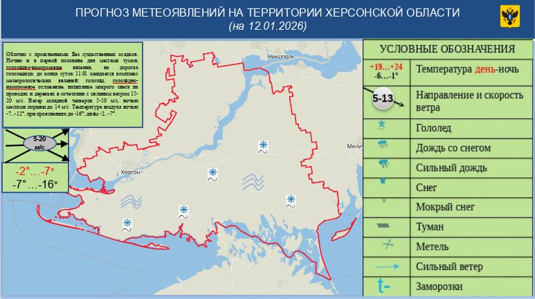"Облачно с прояснениями. Ночью и в первой половине дня местами туман, гололедно-изморозевые явления, на дорогах гололедица. Ветер 5–10 м/с, ночью местами порывы до 14 м/с", — сообщает ГУ МЧС России по Херсонской области.