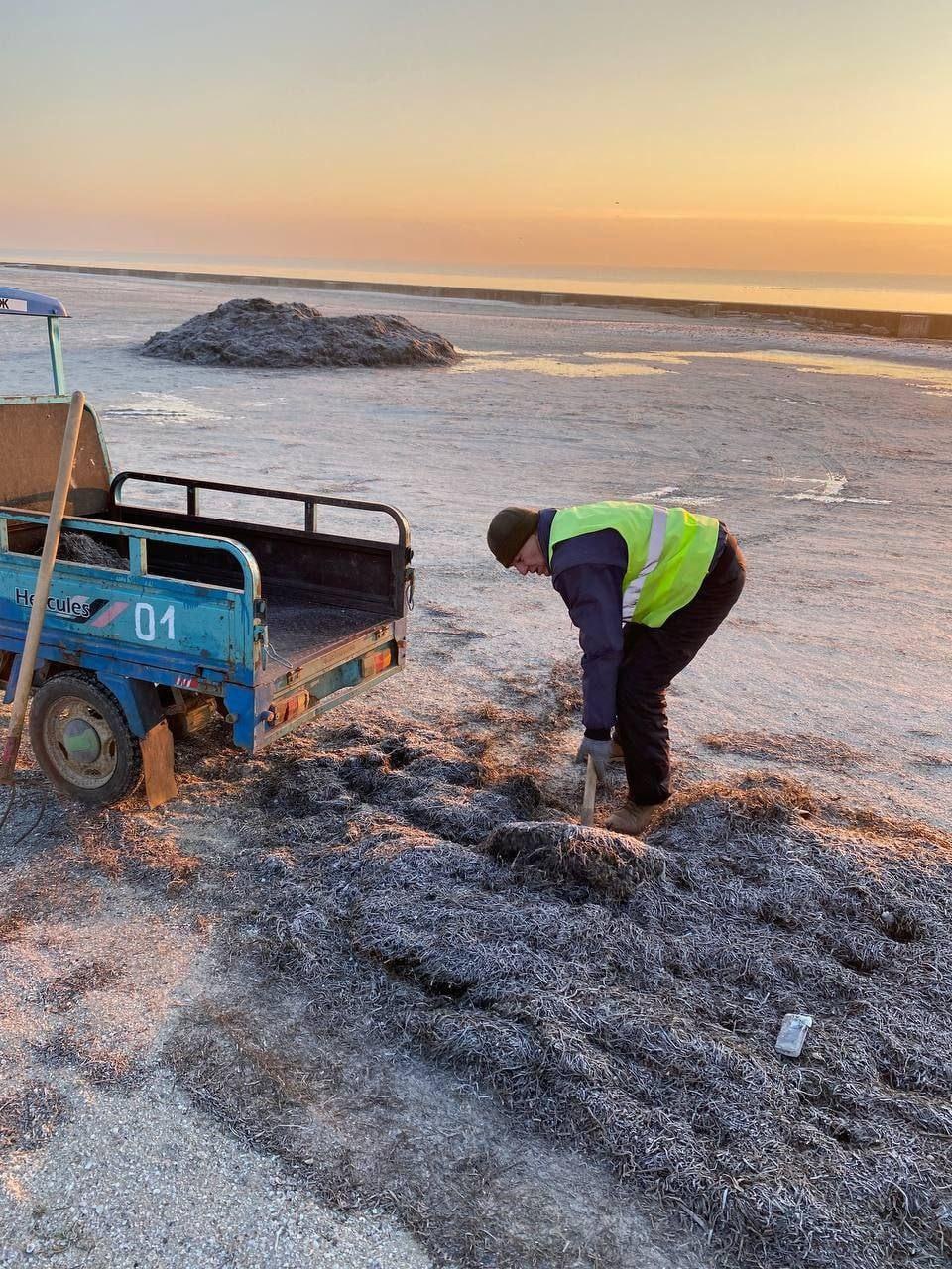 Уборка мусора и камней на городском пляже.