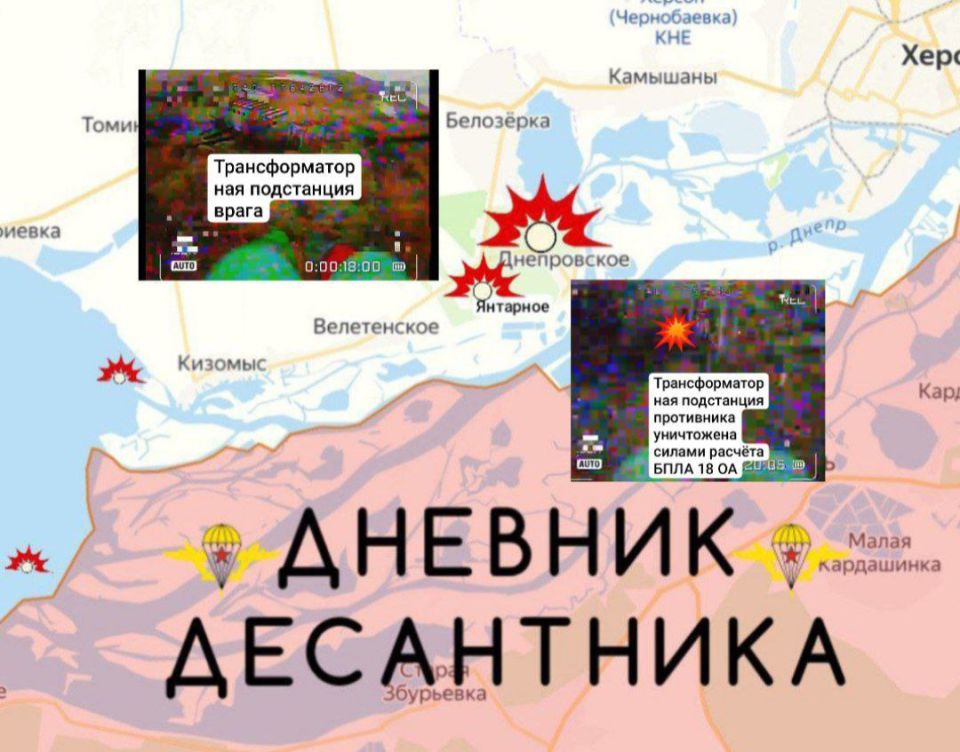 В дельте Днепра подразделения 18 ОА ВС РФ применяют безэкипажные катера для уничтожения плавательных средств врага. В районе населенного пункта Днепровское расчёт 18 ОА ББПС разведывая территорию обнаружил и уничтожил объект критической инфраструктуры ТП врага на правом берегу.
