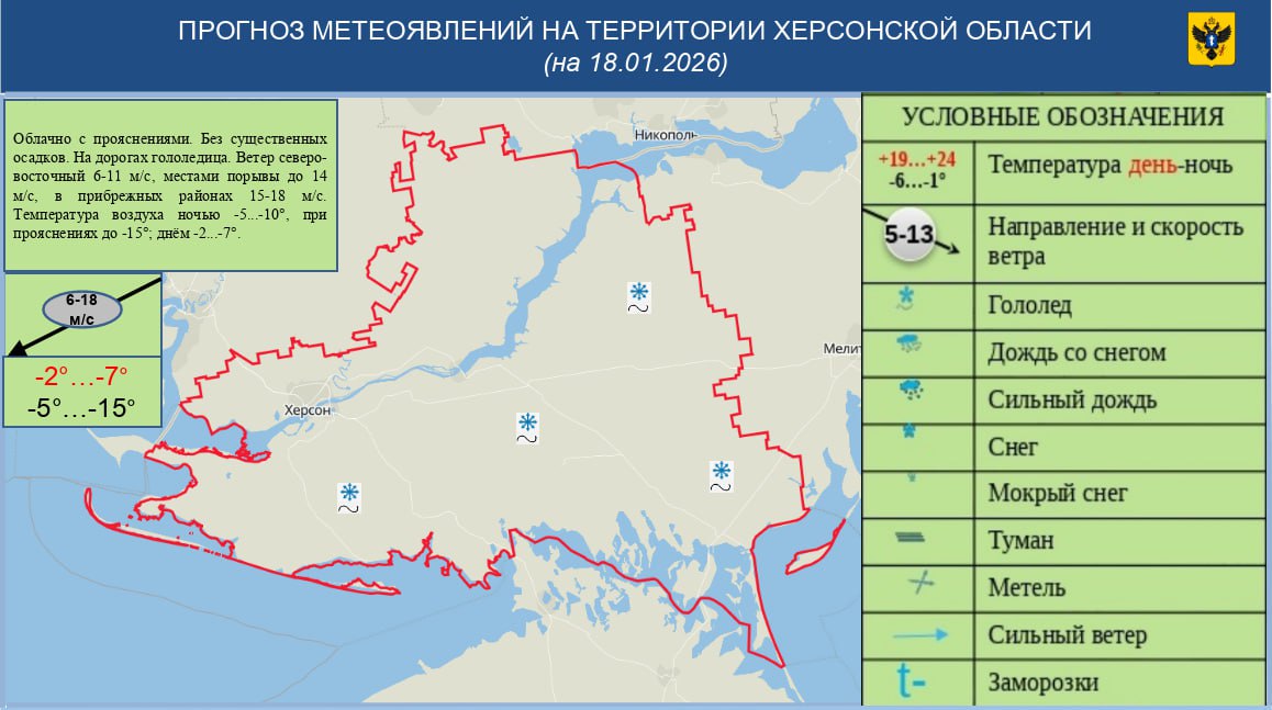 Гололедица и ветер до 18 м/с ожидаются в Херсонской области 18 января