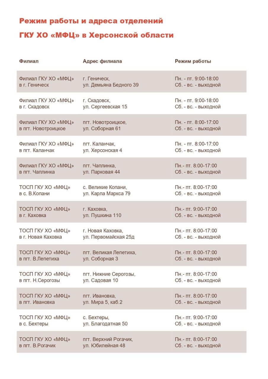 Актуальные адреса и график работы всех отделений МФЦ Херсонской области