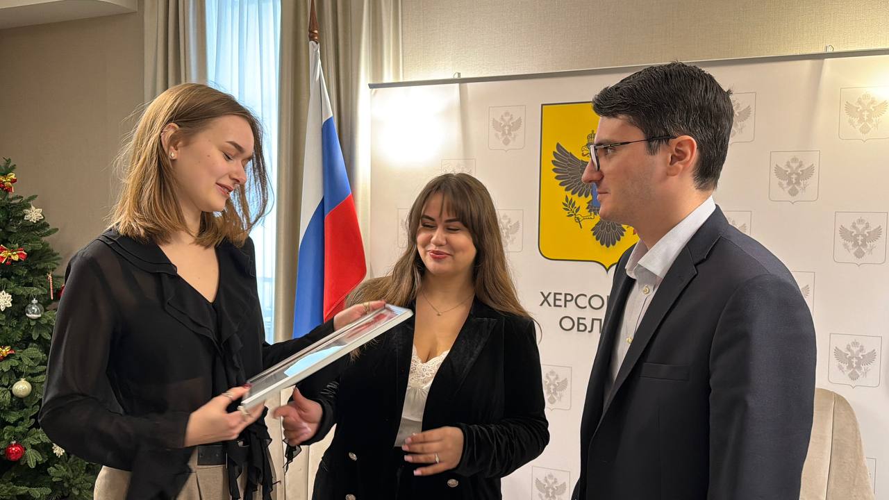По поручению Руководителя Постоянного Представительства Херсонской области при Правительстве РФ Владимира Боделана советник Руководителя Постпредства, заместитель председателя Оргкомитета Второго Таврического инвестиционно-экономического форума Тихон Балаянц вместе с куратором Международного блока ТИЭФ Юлией Симаковой вручили благодарности студентам-переводчикам форума Виктории Казаковой и Марине Садовской за существенный вклад в работу международной секции мероприятия.