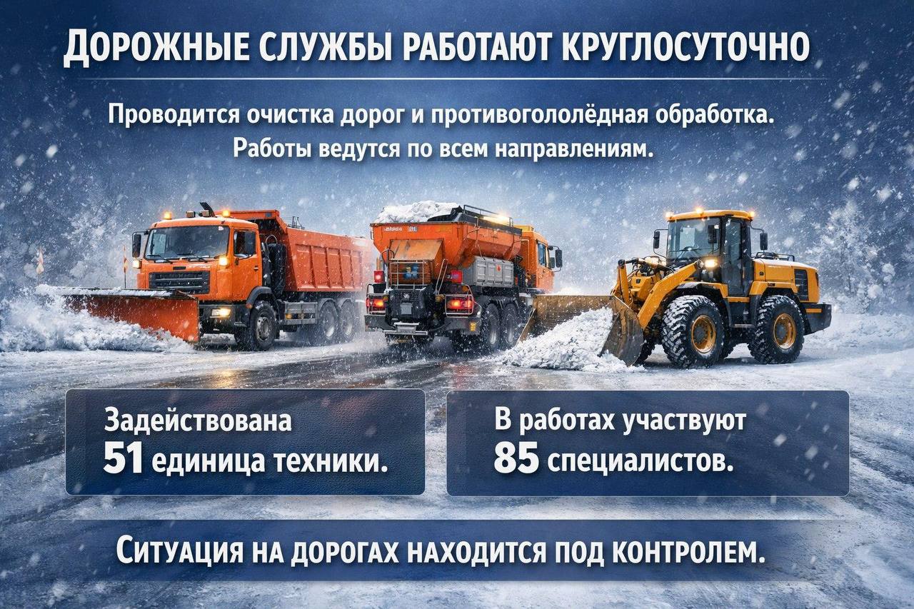 Дорожные службы продолжают мониторинг и выполнение необходимых мероприятий для обеспечения безопасного проезда.