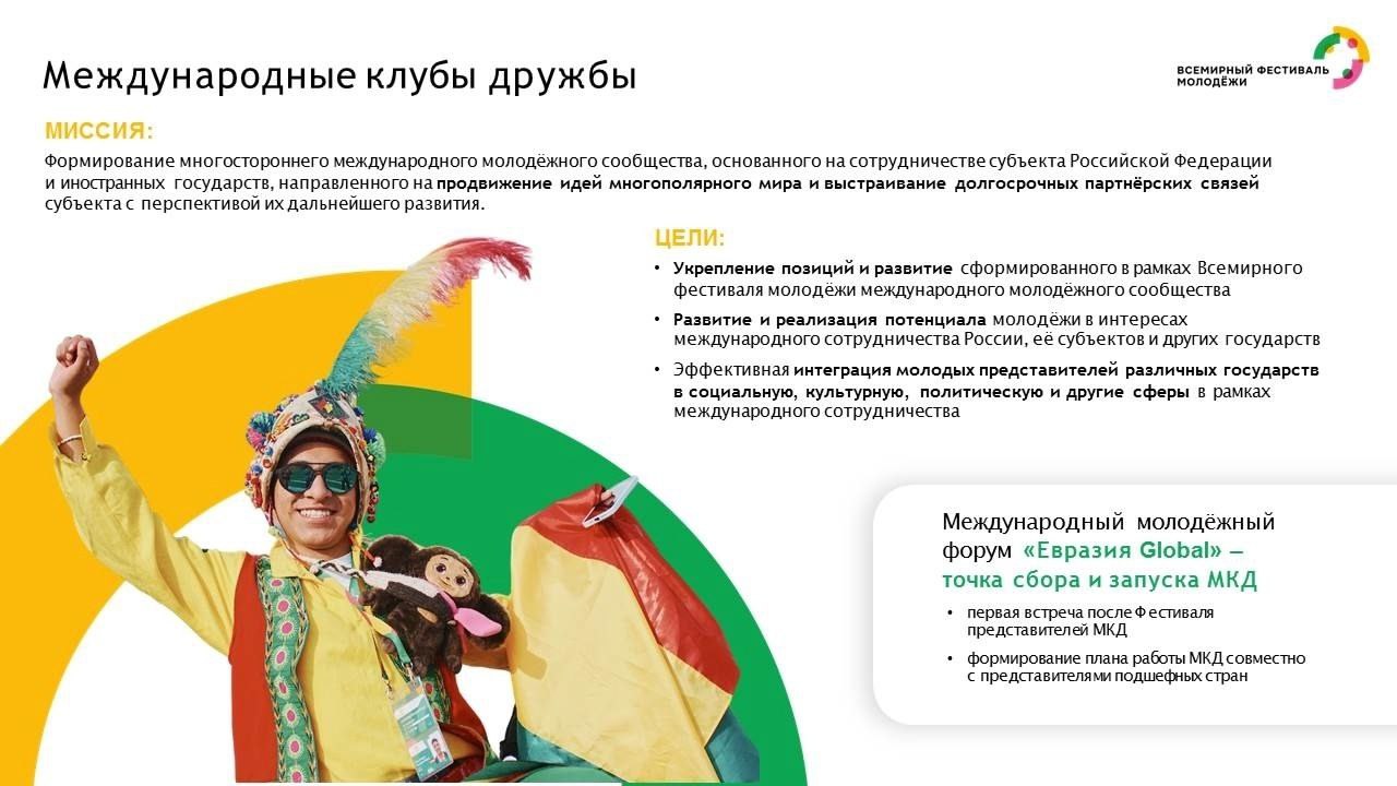 Напомним, что согласно поручению Президента России Владимира Владимировича Путина по всей России открыты Международные клубы дружбы (90 клубов) с целью сохранения главного достояния ВФМ — дружбы между странами.