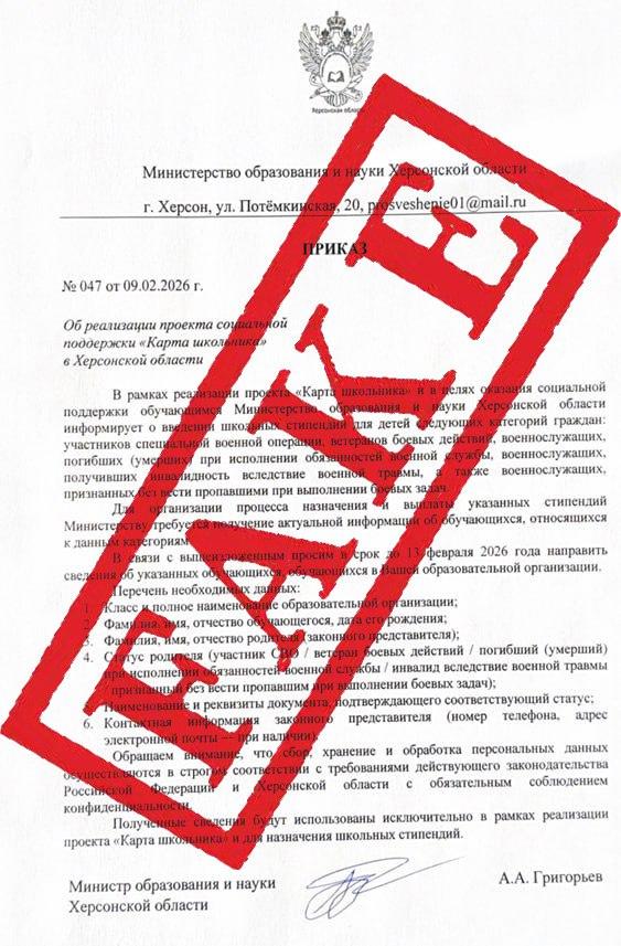 В мессенджере Телеграм появился фейковый приказ Министерства образования и науки Херсонской области №047 от 09.02.2026 г. !