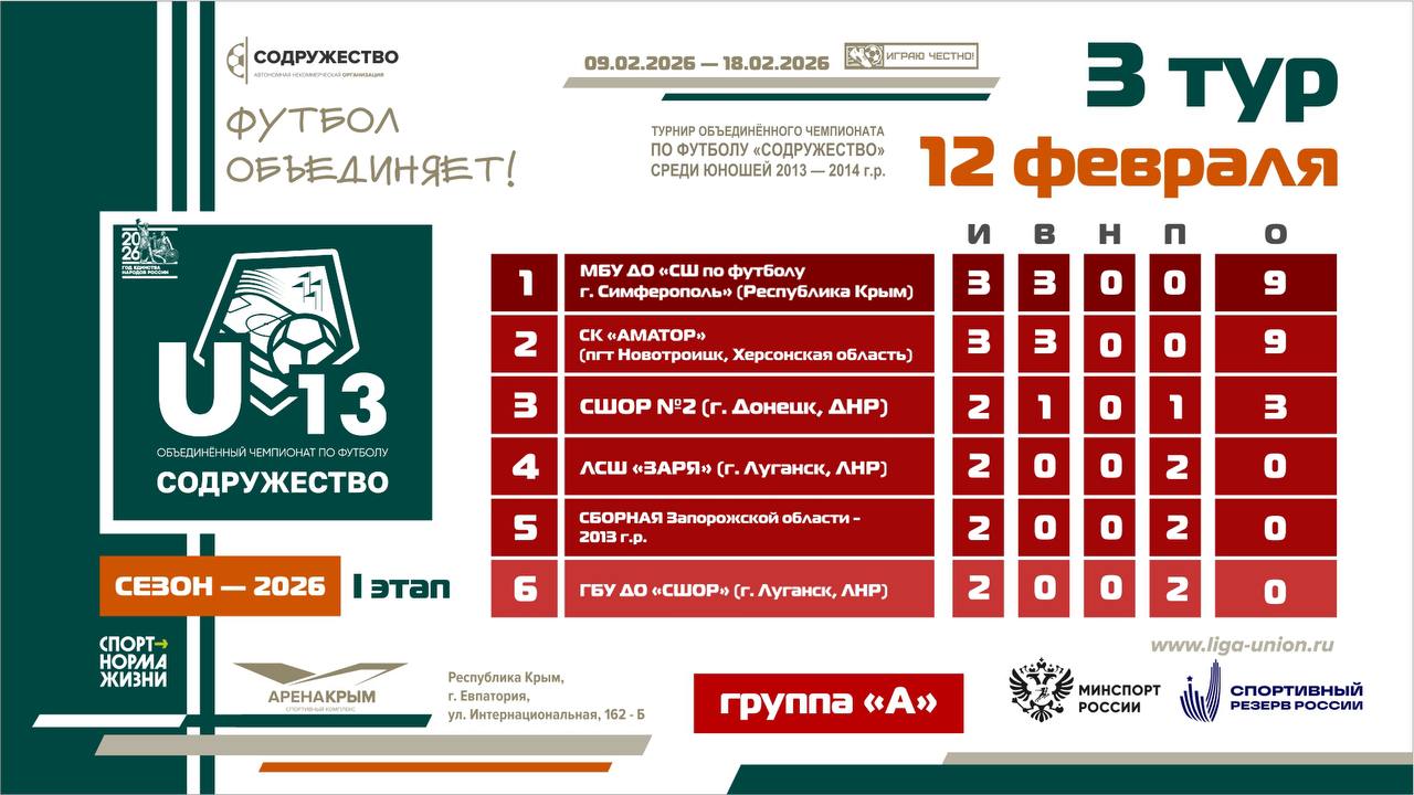 Турнирная таблица после 3 тура I этапа турнира Объединённого чемпионата по футболу «Содружество» среди детей 2013-2014 годов рождения (U13)