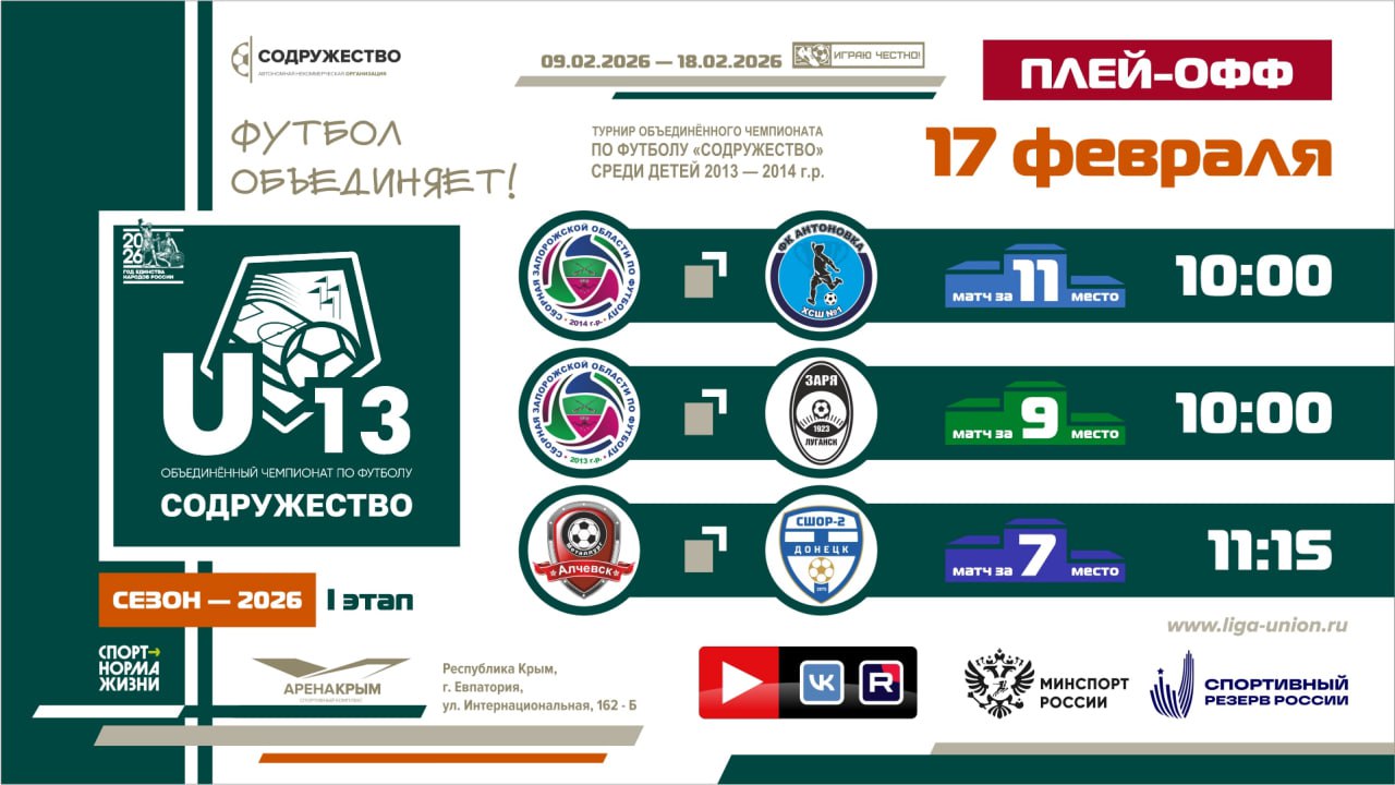16 февраля 2026 года в г. Евпатория состоится седьмой игровой день I этапа турнира Объединённого чемпионата по футболу «Содружество» среди детей 2013-2014 годов рождения (U-13).