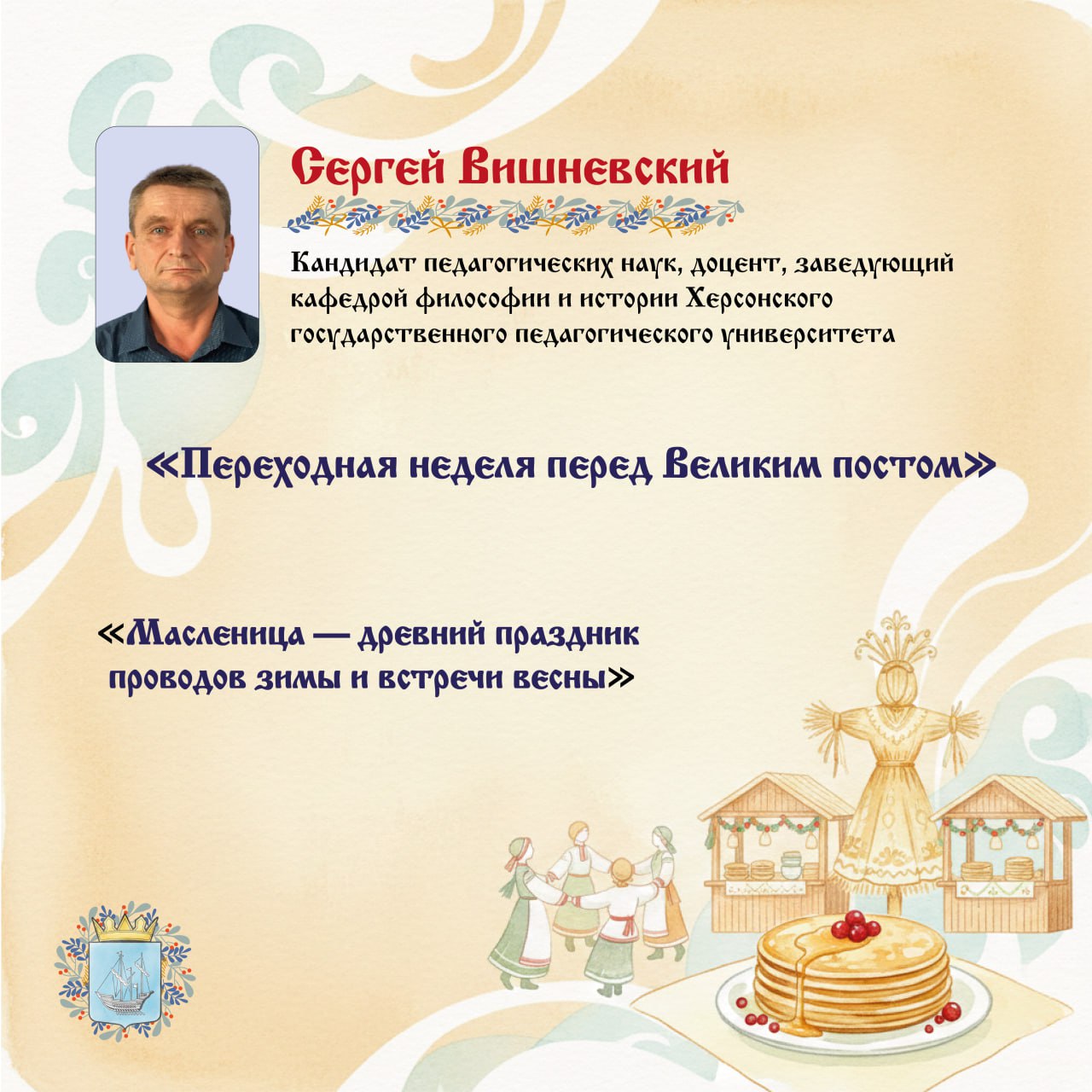 Историк Сергей Вишневский, кандидат педагогических наук, доцент, заведующий кафедрой философии и истории Херсонского государственного педагогического университета, напоминает, что Масленица уходит корнями в Древнюю Русь и до сих пор остается понятной и близкой людям.