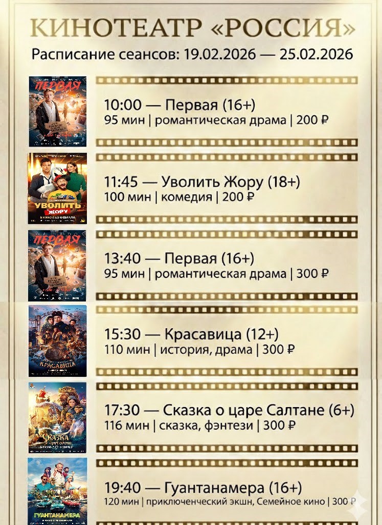 Кинотеатр «Россия» приглашает вас на премьеры фильмов, которые состоятся с 19 по 25 февраля.