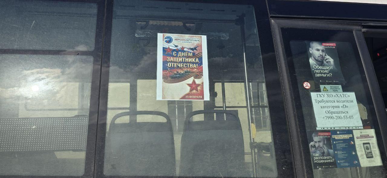 В честь праздника в салонах автобусов появились специальные поздравительные плакаты.