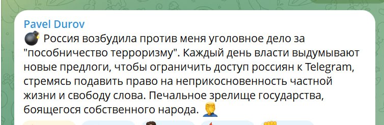«Россия возбудила против меня уголовное дело за "пособничество терроризму". Каждый день власти выдумывают новые предлоги, чтобы ограничить доступ россиян к Telegram, стремясь подавить право на неприкосновенность частной жизни и свободу слова. Печальное зрелище государства, которое боится собственного народа. »