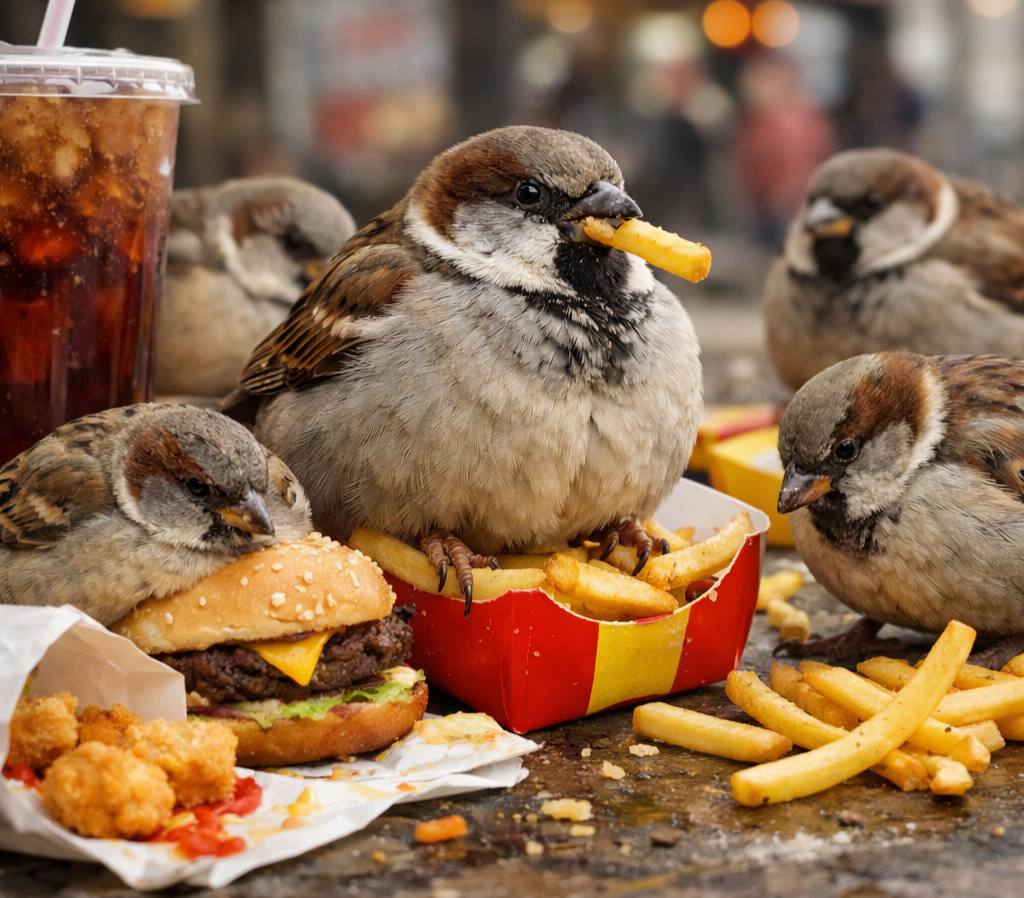Воробьи в городах питаются рядом с точками быстрого питания — это отрицательно сказывается на их здоровье и приводит к ожирению. Птицы теперь могут переваривать быстрые углеводы, меняется их гормональный фон, что приводит к ухудшению размножения.