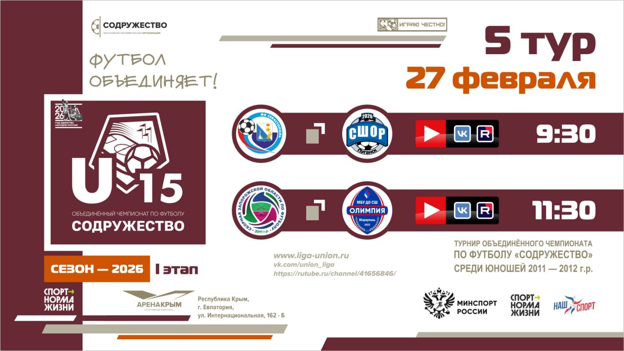 27 февраля 2026 года в г. Евпатория пройдут матчи 5 тура I этапа турнира Объединённого чемпионата по футболу «Содружество» среди юношей 2011-2012 годов рождения (U-15).