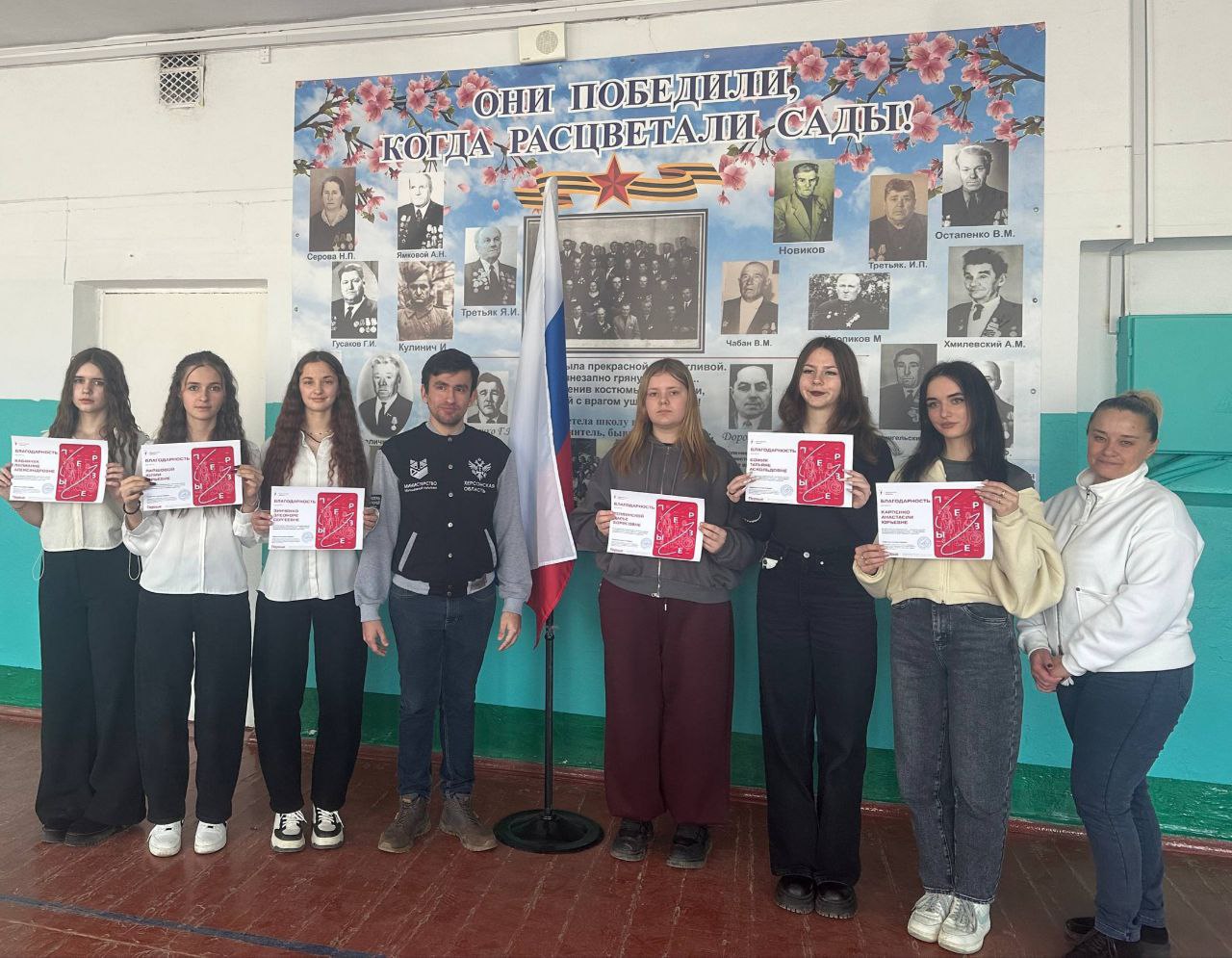 Начальник отдела образования и молодёжи Каховской администрации Наталья Занина и заместитель директора молодёжного центра "Таврический" Иван Губенко вручили школьникам благодарности от "Движения первых" и сладкие призы за их активное участие в акции: