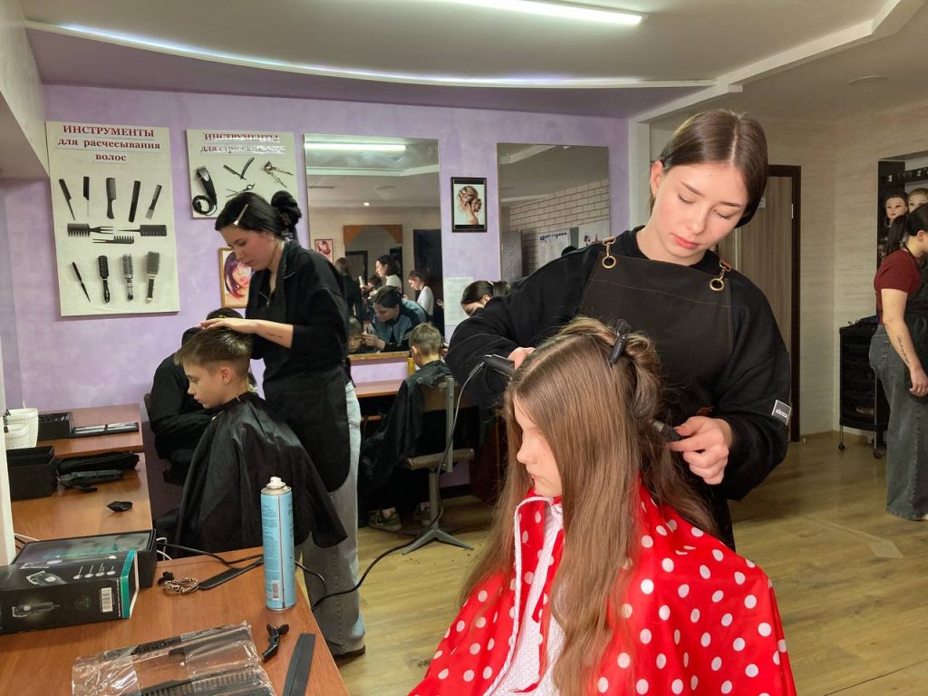 Студенты второго курса, будущие парикмахеры, выступили в роли мастеров. Они создавали причёски и стрижки, внимательно выслушивая пожелания каждой участницы. В ассортименте были классические локоны, афро-косы, сложные косички для девочек и современные стрижки для сыновей ветеранов.