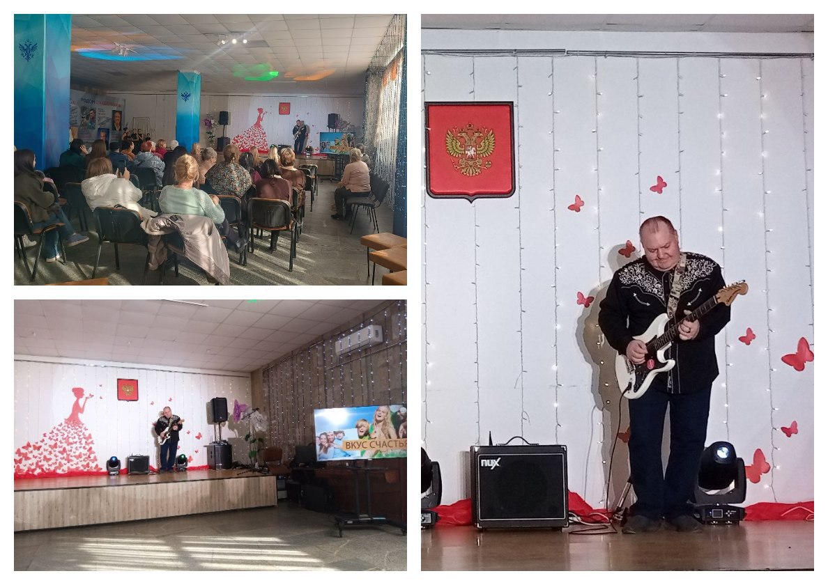 Праздничный концерт открыл Олег Леонидович Саютин, чья завораживающая игра на гитаре мгновенно задала тон всему мероприятию, наполнив зал теплотой и искренними эмоциями.
