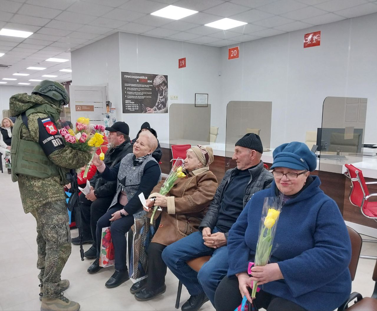 С наступающим праздником весны сотрудниц и посетительниц центра «Мои документы» поздравили представители Военной полиции.