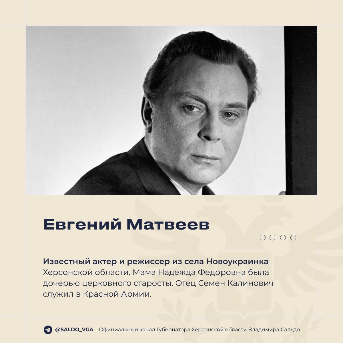 Сегодня вспоминаем нашего земляка — великого артиста Евгения Семёновича Матвеева. Он родился 8 марта 1922 года в селе Новоукраинка на территории нынешнего Скадовского района Херсонской области