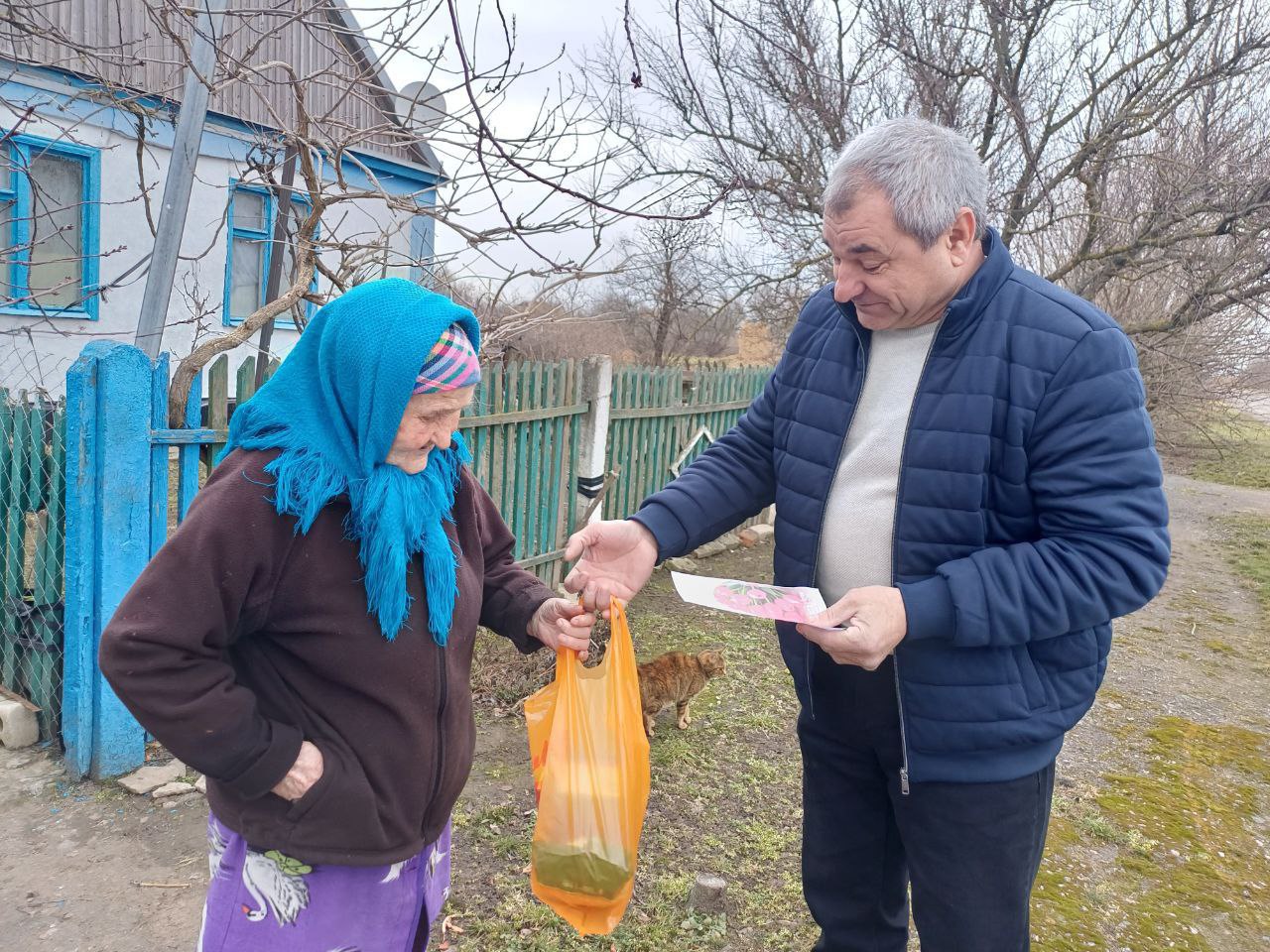 Начальник Костогрызовского территориального отдела Николай Наумченко поздравил с 8 марта одиноких пенсионерок. Женщинам вручили продуктовые наборы.