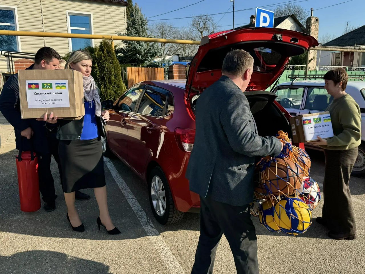 Команда из Крымского района отправилась с гуманитарным грузом в спортивную школу г. Геническа. Юным спортсменам Геническа доставят мячи, боксерские груши, комплекты формы для занятий дзюдо и тхэквондо. Ученики школы № 61 х. Адагум нарисовали рисунки с теплыми пожеланиями для ребят.