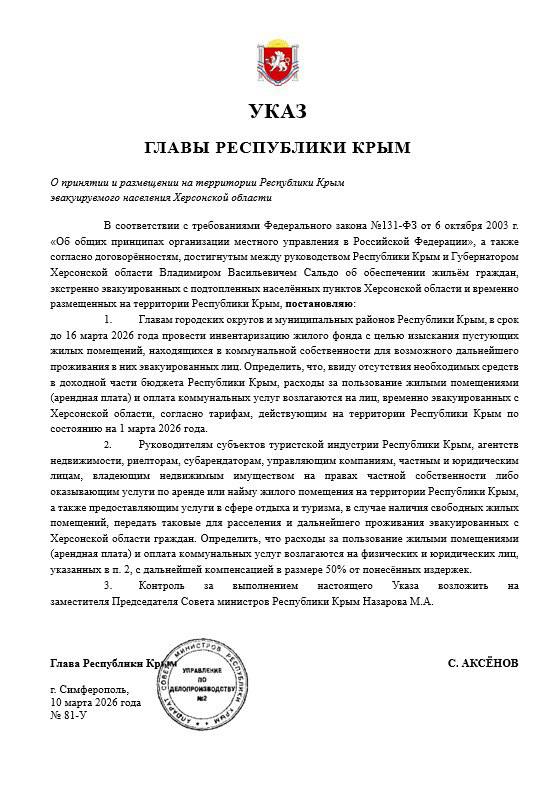 В крымских и керченских чатах и социальных сетях распространяется документ, оформленный как "Указ главы Республики Крым Сергея Аксёнова" о размещении на полуострове эвакуированных жителей Херсонской области.