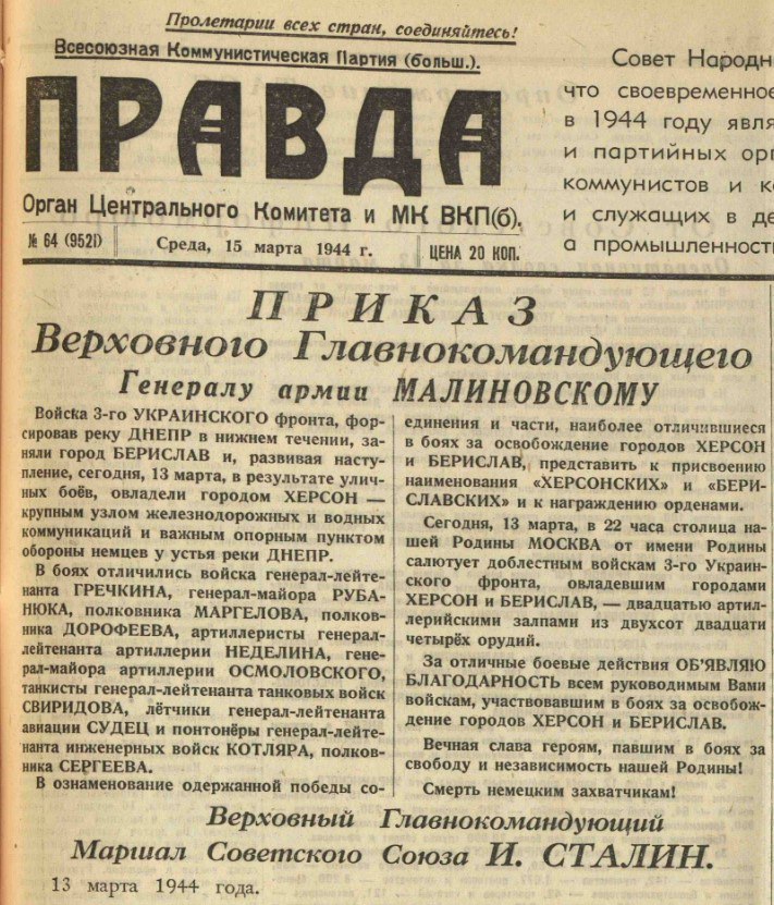 13 марта 1944 года бойцы 295-й стрелковой и 49-й гвардейской стрелковых дивизий под командованием полковников Александра Дорофеева и Василия Маргелова освободили Херсон. Так, 82 года назад, закончились долгие 30 месяцев его фашистской оккупации, 30 месяцев зверств и убийств мирных жителей, грабежа и голода, которые принесли на херсонскую землю нацистские преступники.