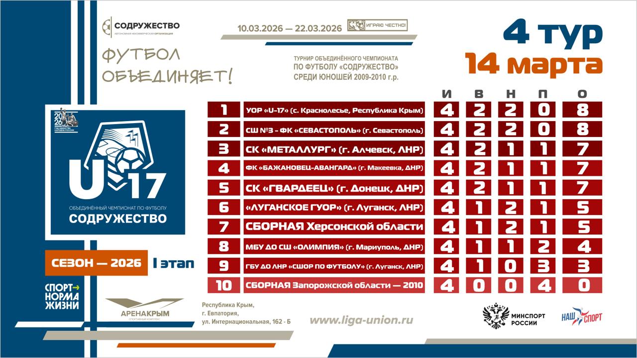 Турнирная таблица после 4 тура I этапа турнира Объединённого чемпионата по футболу «Содружество» среди юношей 2009-2010 годов рождения (U17)