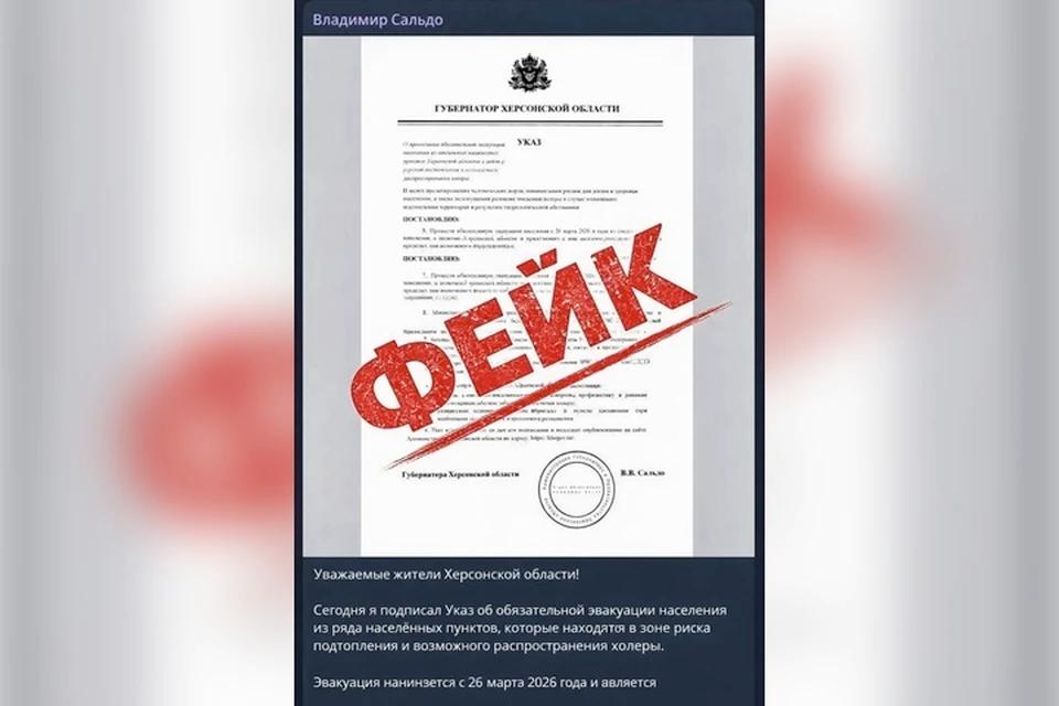 - Уважаемые земляки, в сети распространяют якобы подписанный мной указ об обязательной эвакуации жителей ряда населённых пунктов из-за угрозы подтопления и холеры. Официально заявляю: это грубо сделанная подделка. Несоответствие формулировок, стилистики официальных документов и порядка принятия решений. Никаких указов об обязательной эвакуации в Херсонской области не издавалось, - говорит губернатор Херсонской области Владимир Сальдо.