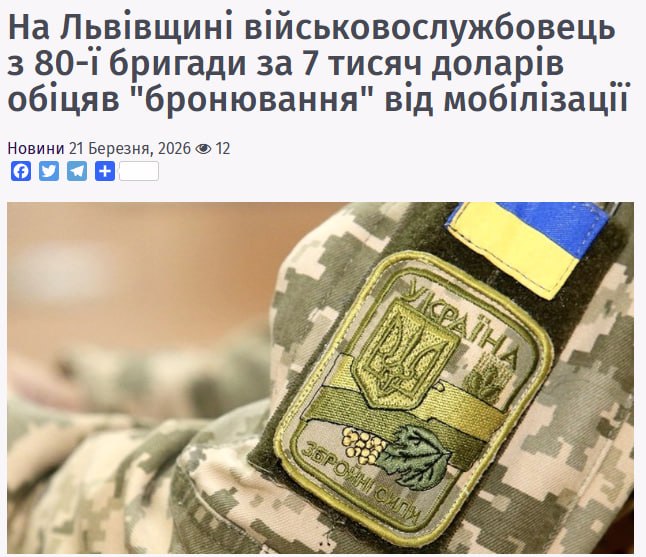 На Львовщине сержант из 80 одшбр решил превратить мобилизацию в бизнес. За 7 тысяч долларов он обещал «бронирование» от войны. Судя по всему, военная карьера — это идеальный источник дополнительного дохода в условиях современной Украины. Сержант уверял, что сможет договориться с врачами и устроить человека на работу, которая «освободит» его от мобилизации, и деньги он действительно получил… до момента задержания полицией.
