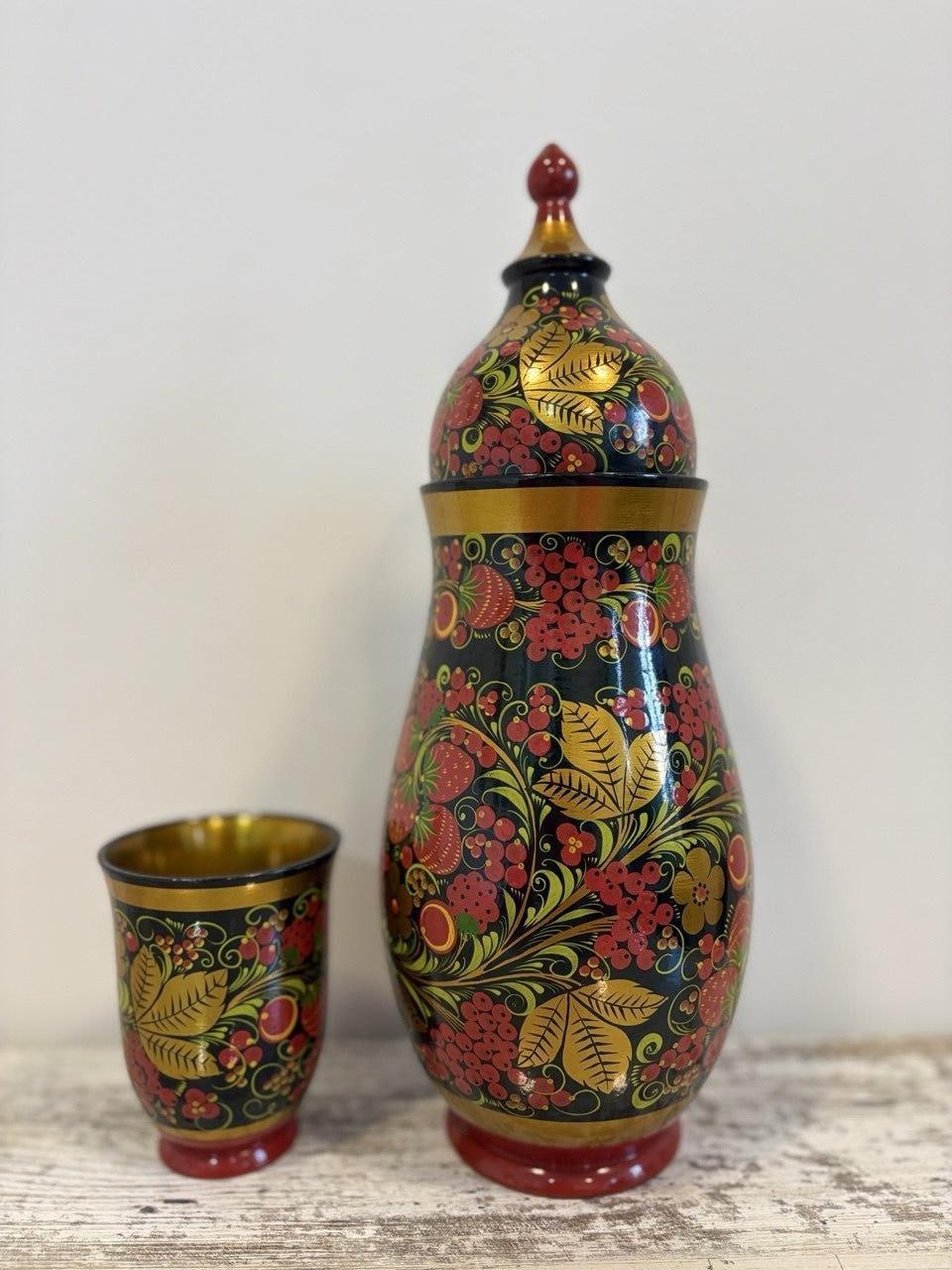 Оба изделия выполнены из дерева и расписаны в традиционной технике: глубокий чёрный фон украшен яркими алыми ягодами, листьями и цветами, а золотистые элементы придают работе торжественный блеск и роскошь.