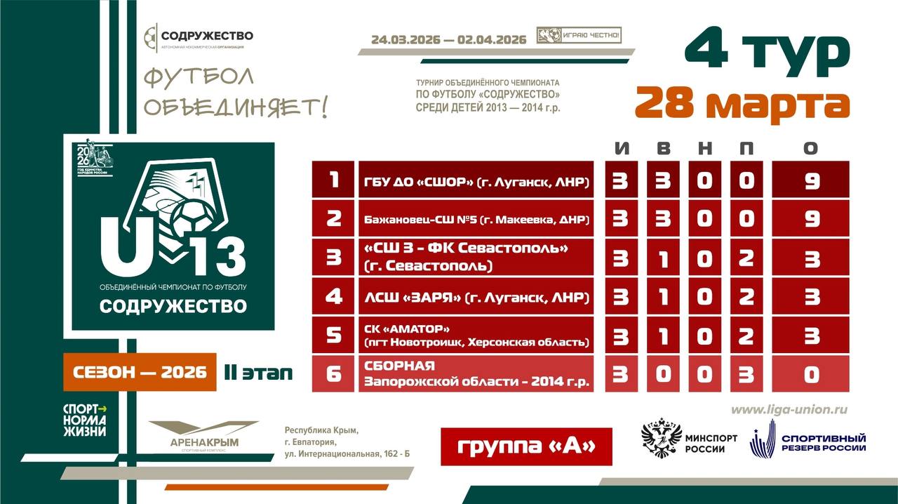 Турнирная таблица после 4 тура II этапа турнира Объединённого чемпионата по футболу «Содружество» среди детей 2013-2014 годов рождения (U13)