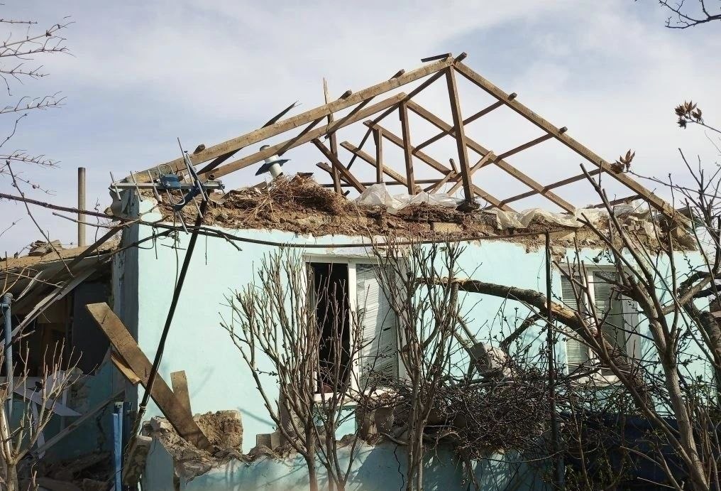 Сброс дрона на жилой дом. Пострадавших нет. В доме рухнула крыша. Разрушена одна из стен.
