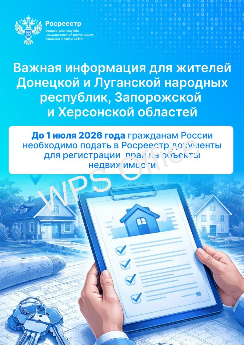 Федеральная служба государственной регистрации, кадастра и картографии (Росреестр) обозначила крайний срок подачи документов для регистрации прав на недвижимость в Херсонской области — 1 июля 2026 года. В Едином государственном реестре недвижимости (ЕГРН) числится 3,8 млн объектов на этих территориях, сведения о правах на которые пока отсутствуют.