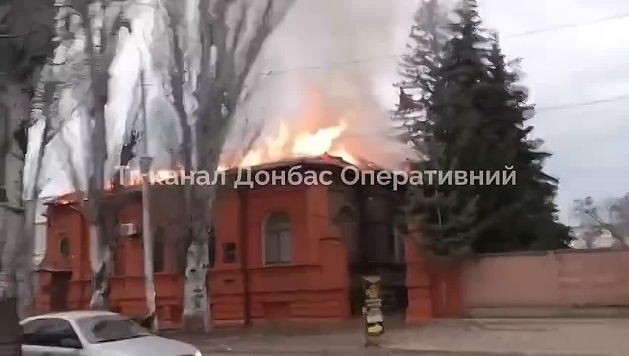 В Славянске зафиксировано поражение здания горотдела СБУ. Судя по характеру возгорания и распространению пламени по кровле и внутренним перекрытиям, можно говорить о поражении с последующим развитием вторичного пожара. Учитывая тип застройки — капитальное кирпичное здание с деревянными элементами перекрытий — огонь быстро распространился по чердачному пространству, что указывает на разрушение несущих конструкций верхнего уровня и вероятное выгорание внутренних помещений.