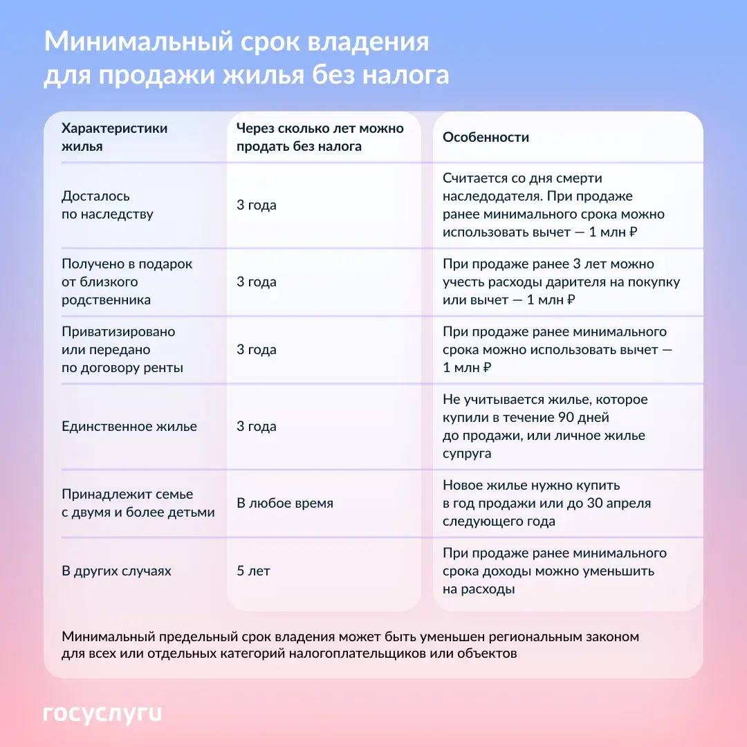В карточке — сроки для продажи без налога для разных случаев приобретения жилья и варианты для уменьшения начислений.