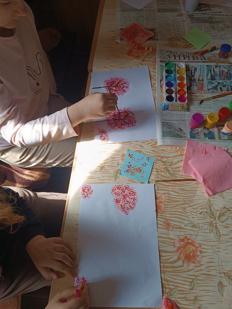 В ходе мероприятия участники освоили необычную технику рисования сакуры с использованием ватных палочек.