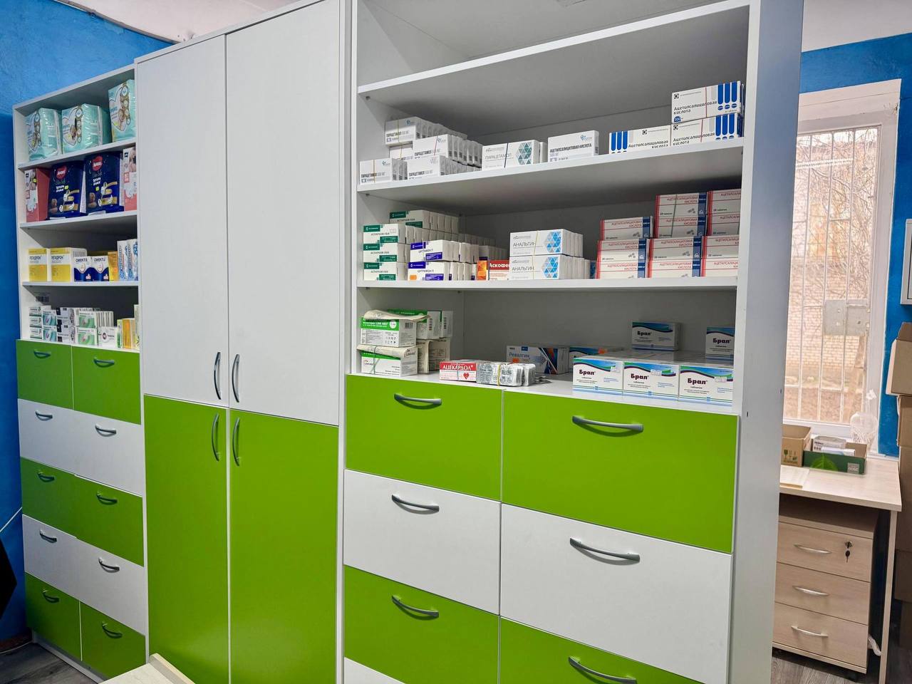 Оснащение государственного аптечного пункта в Чаплинке — установка витрины и прилавков