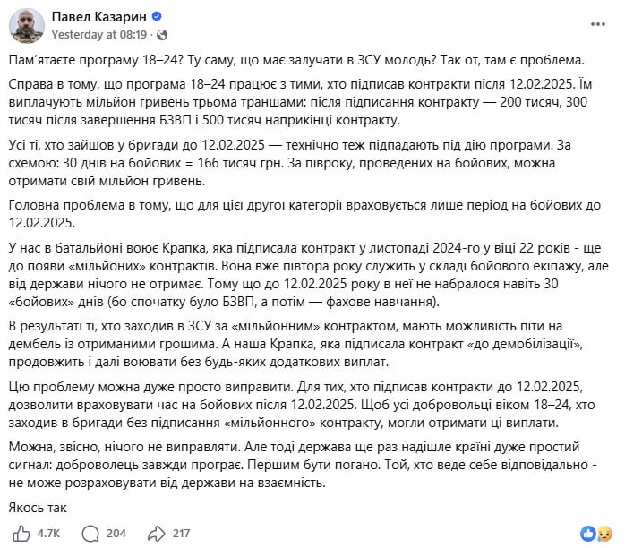 Яркий пример - девушка по позывному Крапка. В 22 года она подписала контракт в ноябре 2024-го, полтора года отслужила в боевом экипаже, но бойовых дней до 12 февраля 2025-го у неё набралось меньше тридцати. Поэтому от обещанного миллиона она не получит ни копейки. Пока новые добровольцы получают первые 200 тысяч сразу, старые продолжают воевать за спасибо.