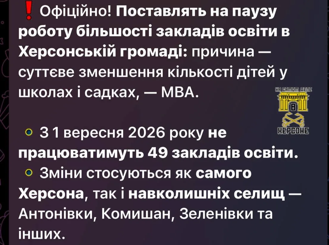 В оккупированной части Херсонщины Киевский режим принял решение приостановить работу большинства образовательных учреждений. Причина — существенное сокращение количества детей в школах и детских садах. С 1 сентября 2026 года не будут работать 49 школ и детсадов — в самом Херсоне, Антоновке, Комишанах, Зеленовке и других сёлах.