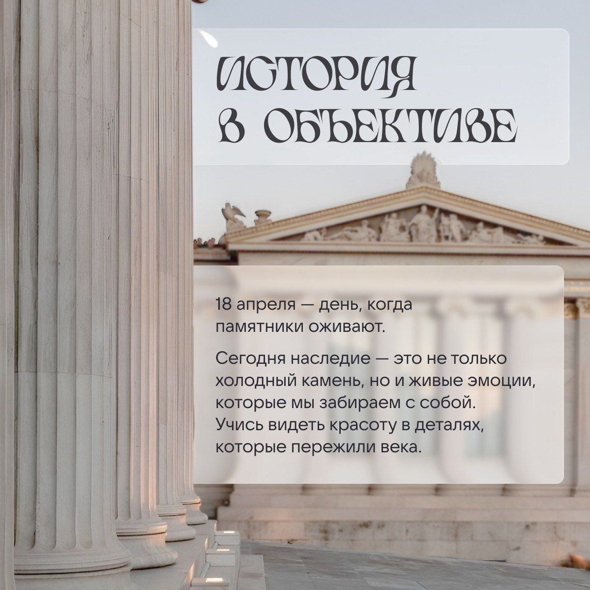 В карточках мы объединили эстетику прошлого и тренды будущего. Узнайте, почему памятники — это наш культурный фундамент и как цифровые технологии помогают сохранить их для будущих поколений.