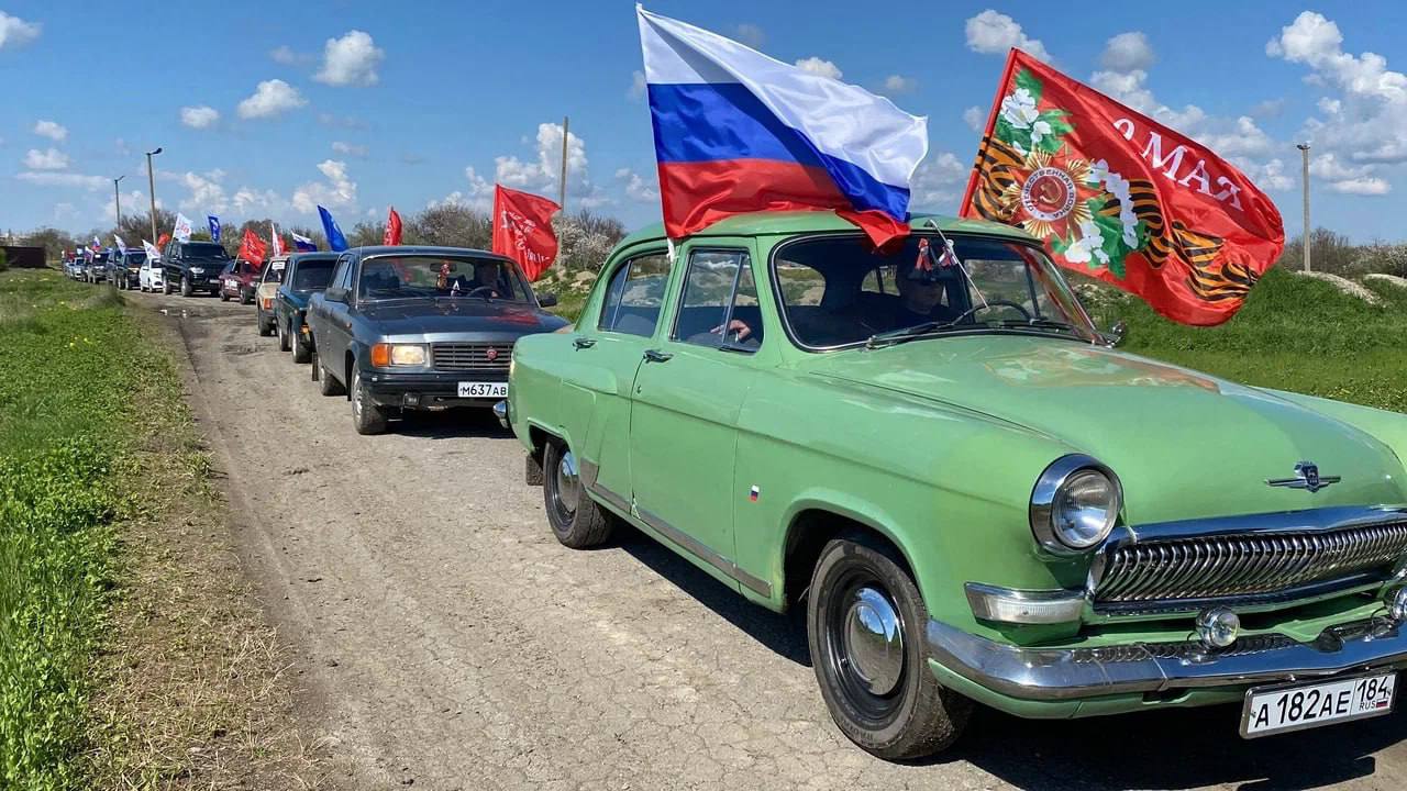 В Херсонской области прошёл первый «Автопробег Победы»: 30 машин проехали по региону с красными знамёнами