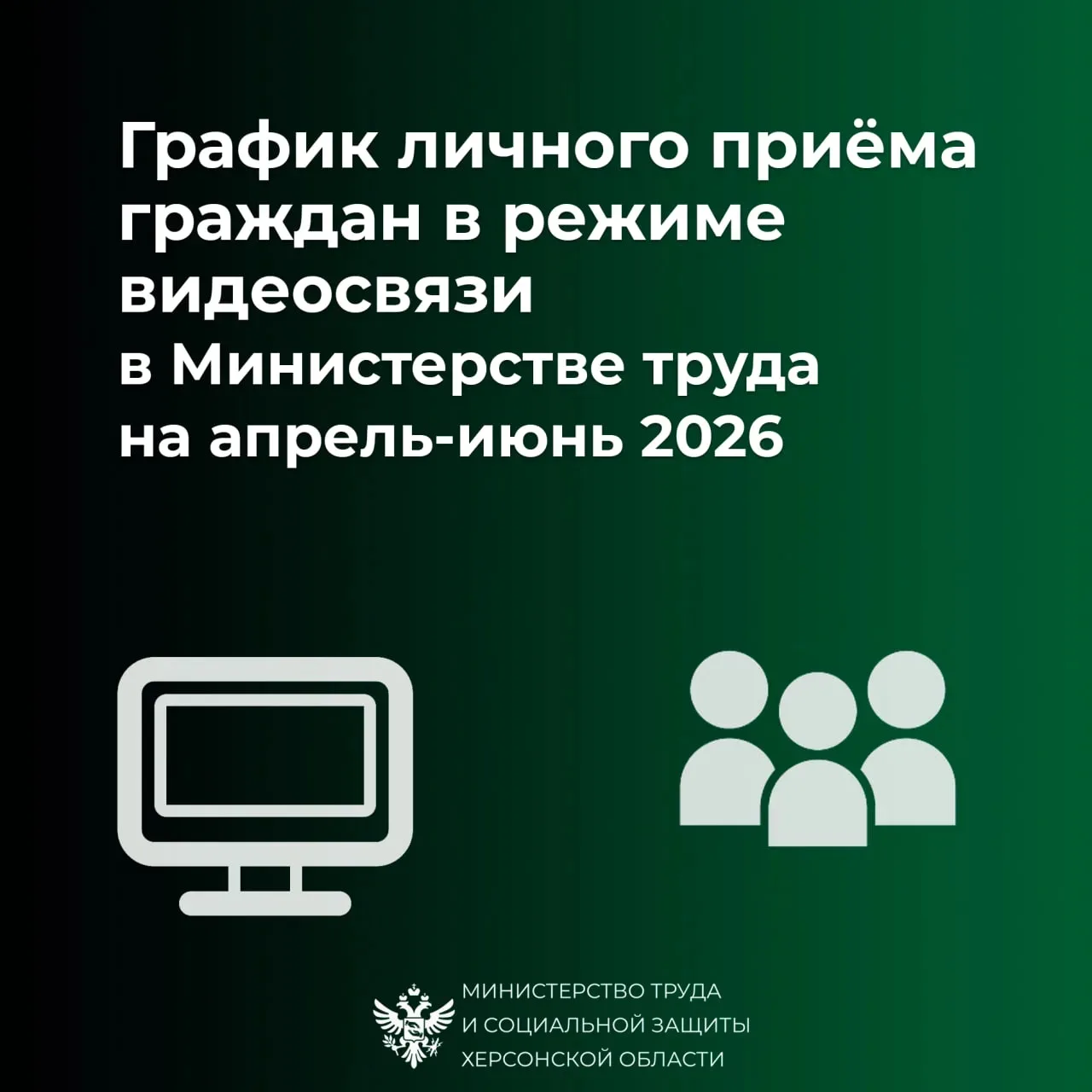 Приём граждан проводится руководством Минтруда Херсонской области по вопросам предоставления региональных социальных выплат, опеки и попечительства, поддержки семей, детей и людей с особыми потребностями, а также по другим вопросам, связанным с социальной поддержкой населения.