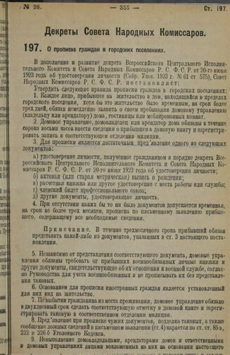 28 апреля 1925 года был принят декрет Совнаркома РСФСР «О прописке граждан в городских поселениях». Этим документом был введен так называемый институт прописки, который просуществовал почти до самого распада СССР.