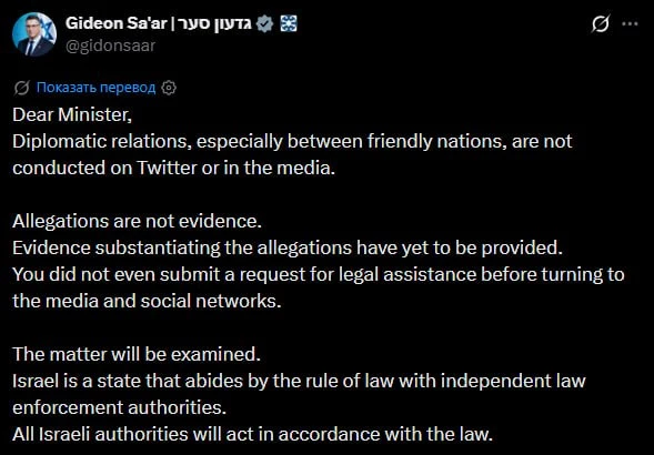 «Дипломатические отношения, особенно между дружественными государствами, не ведутся в Twitter или в СМИ. Обвинения – это не доказательства. Доказательства, подтверждающие обвинения, до сих пор не предоставлены. Вы даже не подали запрос о юридической помощи, прежде чем обратиться к СМИ и соцсетям», – подчеркнул Гидеон Саар.