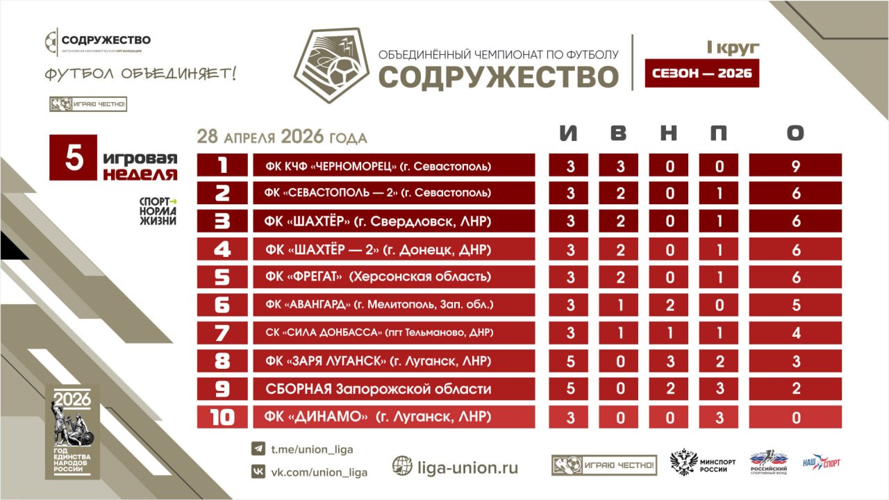 Турнирная таблица Объединённого чемпионата по футболу «Содружество» на 28.04.2026 выглядит так