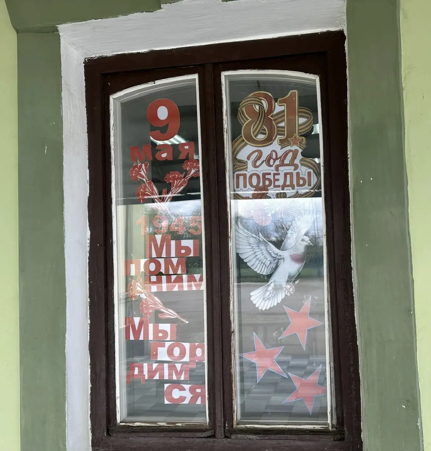 Участники творческих коллективов и сотрудники СДК с особой теплотой украсили окна здания символами Великой Победы: георгиевскими лентами, красными звёздами, голубями мира, силуэтами журавлей и надписями «9 Мая», «Спасибо за Победу!», «Помним. Гордимся».