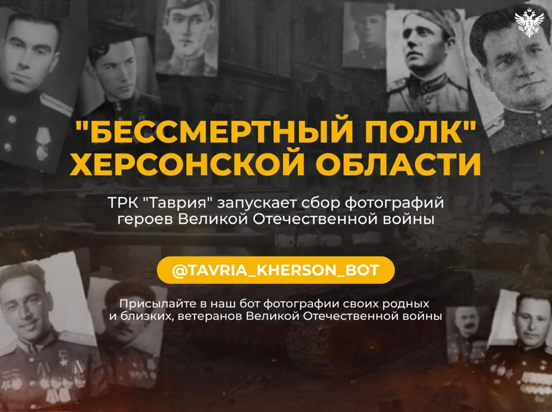 Телерадиокомпания «Таврия» запускает сбор фотографий ветеранов Великой Отечественной войны для создания видеороликов «Бессмертного полка», посвящённых 81-й годовщине Победы. Принять участие в проекте могут все жители Херсонской области.