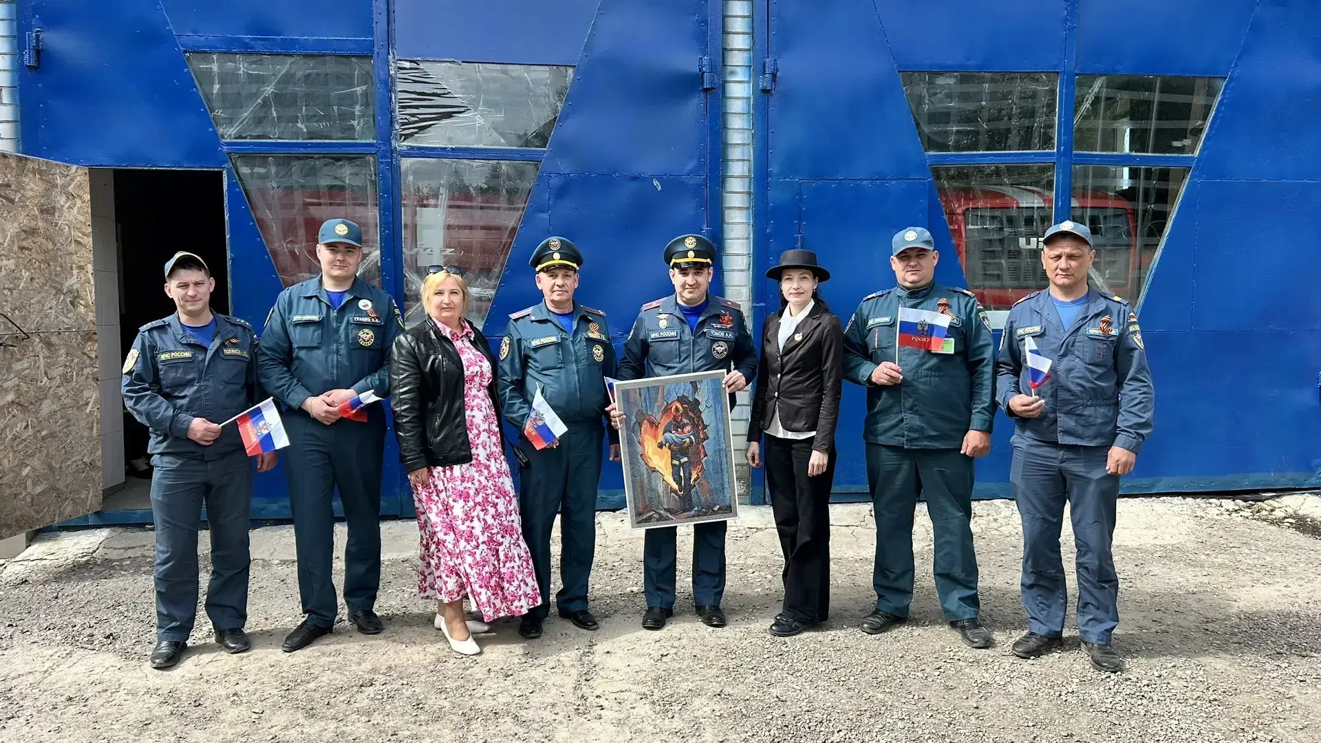 Особым подарком стало произведение сторонника партии Ирины Дудиной – картина, выполненная своими руками в технике алмазной вышивки. На ней изображён отважный пожарный, выходящий из огня, с младенцем на руках, символизируя мужество и спасение жизней.